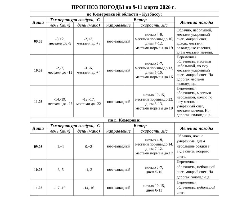 ПРОГНОЗ ПОГОДЫ НА 9-11 марта 2026 г.