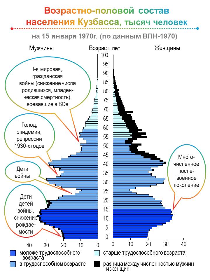 Неровные грани возрастной пирамиды отражают изменения в характере прироста и убыли населения под влиянием нарушений в численности и возрастной структуре населения или в интенсивности его воспроизводства, вызванных, например, войной. Такая деформация оставляет след в возрастной структуре населения и сохраняется на протяжении практически целого столетия.