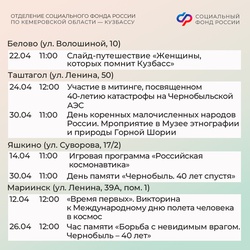 Апрель – время, когда по всей стране вспоминают события на Чернобыльской АЭС. В центрах общения пройдут встречи с ликвидаторами, уроки мужества, часы памяти и познавательные программы. Специалисты регионального Отделения СФР проконсультируют гостей – ликвидаторов ЧАЭС – о мерах социальной поддержки «чернобыльцев».