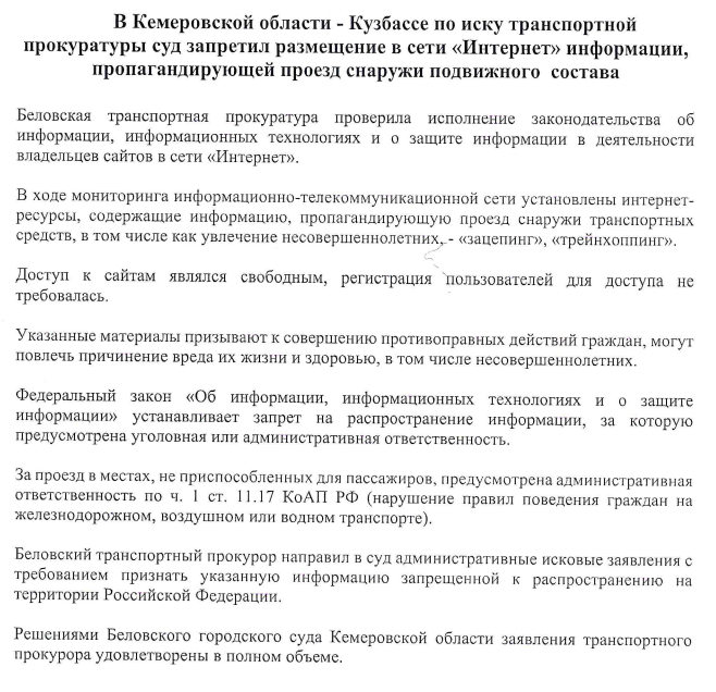 В Кемеровской области - Кузбассе по иску транспортной прокуратуры суд запретил размещение в сети «Интернет» информации, пропагандирующей проезд снаружи подвижного состава